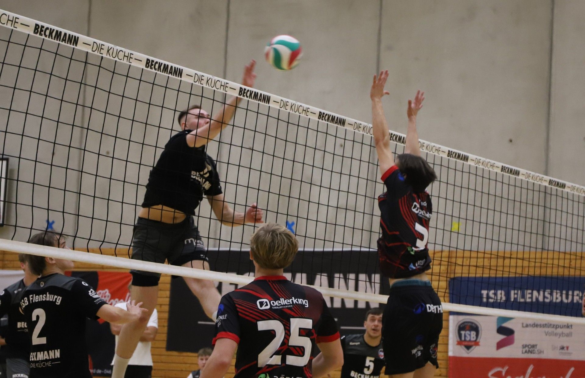 TSB-Volleyballer unterliegen beim TuS Hasseldieksdamm/Mettenhof Kiel. Die Regionalliga-Volleyballer des TSB Flensburg waren am vergangenen Spieltag auswärts beim Tabellensechsten TuS Hasseldieksdamm/Mettenhof gefordert. In einer emotionalen Partie mit intensiven Ballwechseln musste sich Flensburg am Ende mit 1:3 (25:20, 16:25, 22:25, 18:25) geschlagen geben. Flensburg startete gut in die Begegnung und agierte im ersten Satz im 5-1-System mit Emil Christiansen auf der Zuspielposition. Durch konsequente Defensivarbeit und ein mutiges Angriffsspiel sicherte sich der TSB den ersten Satz mit 25:20. Besonders Libero Tade Scholz überzeugte in dieser Phase mit zahlreichen guten Abwehrkontakten. Der zweite Satz gestaltete sich zunächst ausgeglichen. Die Kieler agierten in dieser Phase sehr konsequent und nutzten kleine Unsicherheiten auf Flensburger Seite. Beim Spielstand von 14:21 stellte der TSB vom 5-1- auf das 4-2-System um. „Wir wollten mehr Tempo und Variabilität ins Angriffsspiel bringen.“ begründet Coach Gunnar Hansen diese Maßnahme. Dies wirkte jedoch nicht sofort. Mehrere Chancen blieben ungenutzt, so dass dieser Durchgang mit 16:25 an die Gastgeber ging. Im dritten Satz nun wieder ein anderes Bild. Die Flensburger erspielten sich eine komfortable 19:14-Führung und standen somit kurz vor dem Punktgewinn für die Tabelle. „Leider riss bei uns an dieser Stelle der Faden.“ kommentiert ein enttäuschter Coach Gunnar Hansen das Geschehene und schiebt nach: „Heute wäre ein Punktgewinn drin gewesen.“ Mehrere missglückte Annahmeversuche sowie einfache Fehler im Angriff führten zum 19:19-Ausgleich. Von diesem Rückschlag konnten sich die Flensburger nicht mehr erholen und mussten den Satz knapp mit 22:25 abgeben. Damit war die Messe gelesen: Der vierte Satz verlief klar für die Gastgeber. 18:25 stand es am Ende. Trotz des Ergebnisses bot die Partie viele sehenswerte Ballwechsel sowie eine starke Defensivleistung von MVP Tade Scholz, die Hoffnung auf weitere gute Spiele macht. Der Blick richtet sich nun nach vorne: Am 14. Februar empfängt der TSB Flensburg den Tabellennachbarn Eimsbütteler TV (19 Uhr Fördegymnasium) zum durchaus wichtigen Spiel um den Ligaverbleib. Autor: Emil Christiansen Fotos: Luc Thomsen